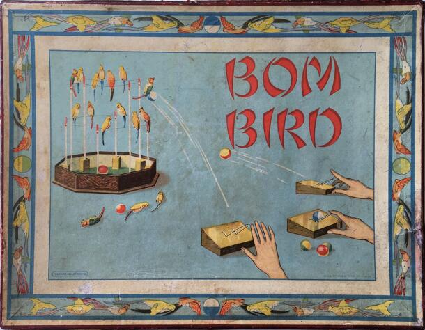 This undated Chad Valley title is a dexterity game using a wood and metal spring launcher, a hollow celluloid ball, and five target birds, also hollow celluloid, that balance on a wire. The box is used as the base for the target. A cardboard cutout of a row of trees, ranging from 6" to 8" high, is inserted into two wooden holders fixed at the front of the...