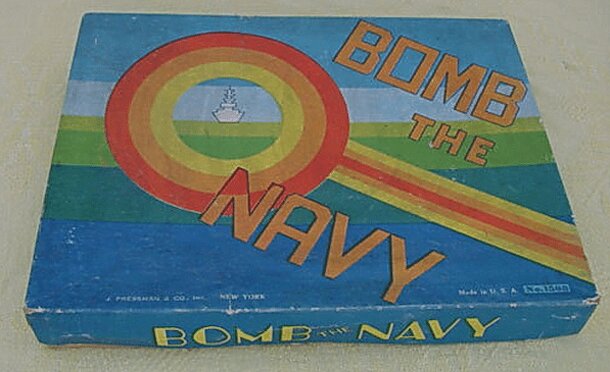 This game uses marbles to Bomb the Navy. The game originally came with unpunched cardboard ships with little cardboard stands, marbles, and a set of instructions. Players roll the glass marbles to try to knock of the ships. However, it appears that some versions use projectile pellets and rubber bands with a wooden cannon instead of marbles. The number of...