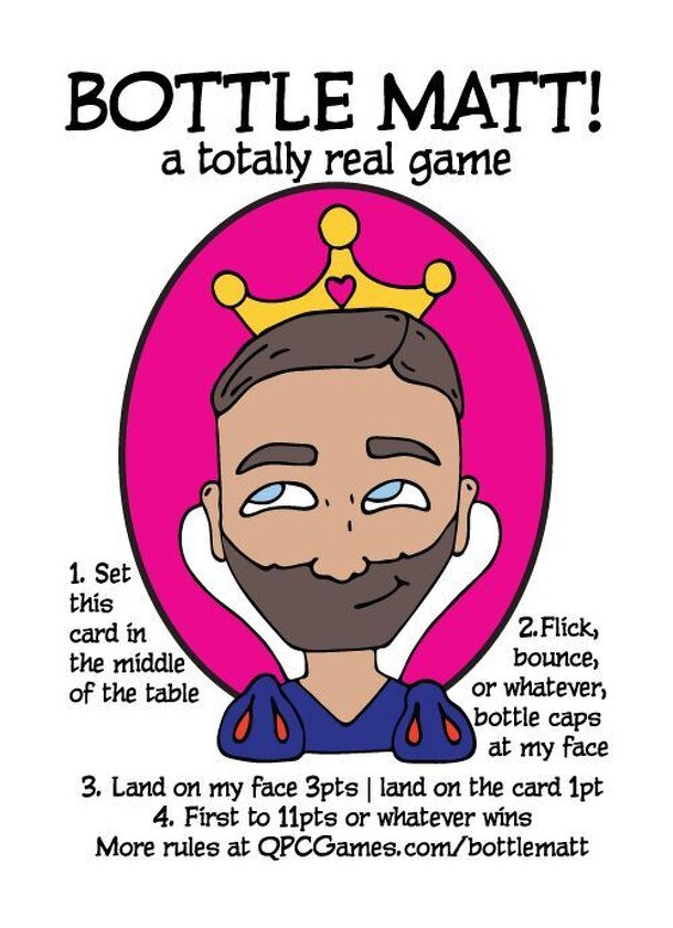 Micro dexterity game featuring Princess Fantastic. And drinking. Lots of drinking. The basic rules are as follows: 1. Set this card in the middle of the table 2. Flick, bounce, or whatever, bottle caps at my face 3. Land on my face 3pts | Land on the card 1pt 4. First to 11 or whatever wins! There are also a growing number of variant and advanced rules...
