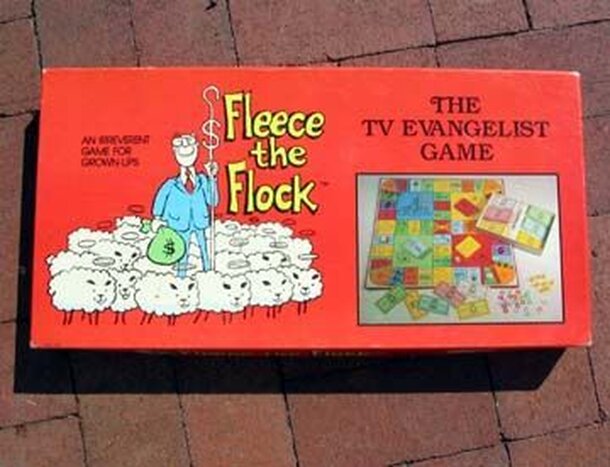 You take on the role of a televangelist trying to amass your empire of TV stations, theme parks, stretch limos, record companies, missions, and corporate jets. Starting with 50 million dollars, look out for Devil, Angel, and God's Will cards. Through it all you will be gripped by intrigue, strategy, and subterfuge that is sure to keep everyone in tingling...