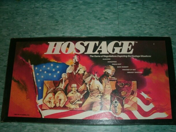 "INTRODUCTION: This game is designed to represent all hostage situations that may occur. Six of these situations are represented in HOSTAGE: BANK ROBBERY, EMBASSY TAKEOVER, HIJACKING, KIDNAPPING, PRISON RIOT AND PRISONER OF WAR. OBJECT OF THE GAME: The object of HOSTAGE is to acquire, in proper sequence, the six steps of negotiation towards the resolution...