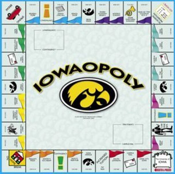 The Game Includes: Tokens: Gym Shoe, Graduation Cap, Alarm Clock, #2 Pencil, Bicycle Board Spaces: Kinnick Stadium, South Johnson, Herky the Hawk, Iowa Memorial Union Cards: You're picking up a pizza from Pagliai's. Collect $25 from each player. It's 10 degrees below zero in Iowa City, IA. The token of your choice is frozen for two turns. Recite the fight...