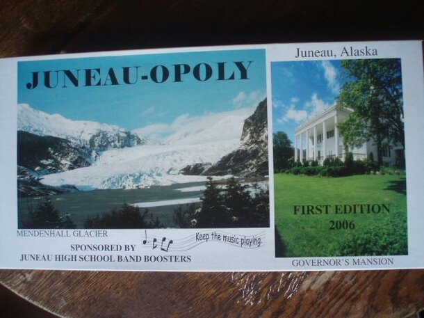 Juneau-Opoly was designed in 2006 as a fund-raising board game for the Juneau Douglas High School Band Program. It is played much like Monopoly in that players roll dice to advance around the board and purchase properties. Properties are named after Juneau, AK businesses and once a player acquires all the businesses in a set he/she may purchase customers...