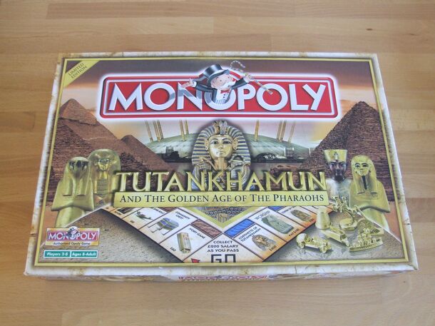 Monopoly version based on the Tutankhamun exhibition that toured the world from 2005 and is still touring. To commemorate its arrival at the O2 (The Millennium Dome) in London, a special edition was produced. Contents: Gameboard, 10 Playing Tokens (Standard set but in gold), 2 Dice, 32 Shrines, 12 Pyramids, 1 Property Pouch, 28 Title Deed Cards, 16 Chance...