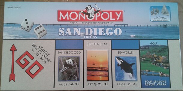 Back of Box: Advance to GO! The MONOPOLY Brand introduces the new San Diego edition showcasing America's Finest City. This game puts San Diego's most valued historical landmarks, cultural treasures and word-class tourist attractions up for sale. Includes custom board, Golf & Beach cards replace Chance & Community Chest cards, "Sunshine Dollars" from the...