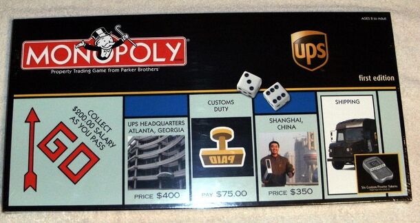 UPS themed Monopoly. The drill is well known by now: roll the dice, move and become the wealthiest player through buying, renting and selling property. The properties are UPS locations around the world, houses and hotels are UPS stores and UPS hubs. Chance and community chest cards are replaced by shipping and leadership cards. The tokens are UPS shipping...