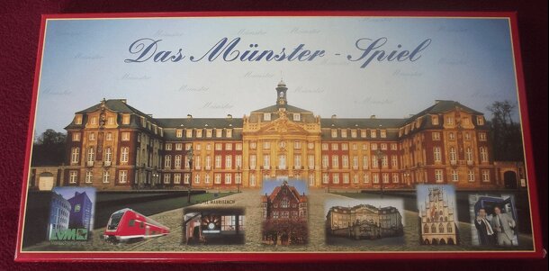 Commercial game, related to Monopoly, for the purpose of promoting the city of "Münster", in the West of Germany. The players move around a board, which consists of 40 squares. On most of the squares are parts of companies, which can be bought. The companies have values between 1000 and 8000. Three companies are combined by a color. Whenever a player lands...