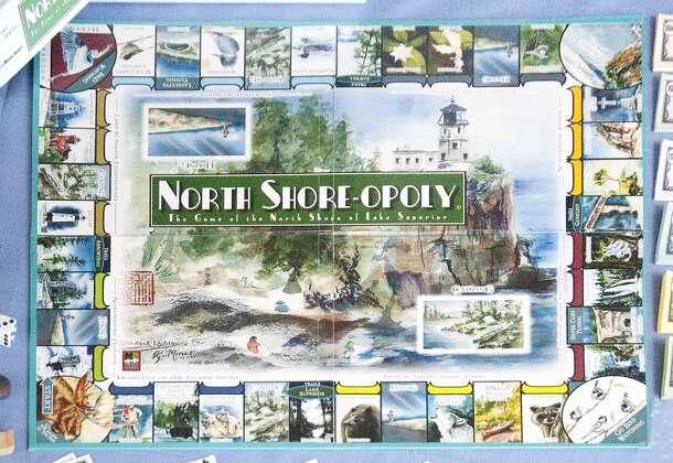 Property trading game about the places, plants and animals of the North Shore of Minnesota bordering Lake Superior. The game utilizes the watercolors of Brian Minor and Rebecca Minor to illustrate the game board, game box and deed cards. Manufactured individually by hand in Superior, WI by Brian Minor and his family. Playing pieces are actual pebbles...