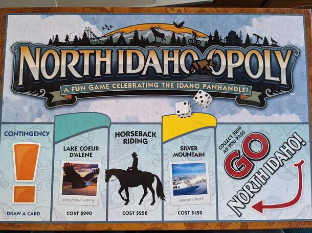 An unofficial Monopoly-style game featuring Idaho Panhandle lakes, state parks, outdoor recreation destinations, and a couple mines and fairs, as properties, and similar topics on random event cards. The remainder of the game's not specific to Idaho in any way - metal playing pieces (a hand, a smile, a heart, a dog, a pretzel, and a shoe), green and red...