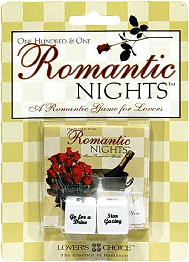 One Hundred & One Romantic Nights: A Romantic Game for Lovers This comes with two custom six-sided dice and an brief instruction brochure in a card-backed plastic bubble package. The two dice have sides that read: 1) Home Escape, Hugs & Kisses, Star Gazing, Talk, Show Time and Love Notes 2) Go for a Drive, Dinner, Picnic, Breakfast, Naughty but Nice and Go...