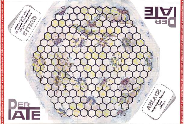 The game "Der Pate" was included in Spielbox 6/90 as part of the "Spiel im Heft/Game in the zine" series. The board is played on a large hexagon containing 184 hexes. 6 home cities in the middle circle are surrounded by 2 x 6 free cities in the outer and inner part of the board. 30 playing pieces and 1 special piece (the "pate") per player are provided...