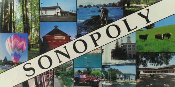 One of many local variations on the boardgame Monopoly, Sonopoly is based on Sonoma County, California. Produced by Santa Rosa-based Trinity Productions in 1985, it was assembled by Rapid Mounting and Finishing Co. of Burlingame, California. The mechanics, most rules, board, and themes are mostly the same as Monopoly, but there are some significant...