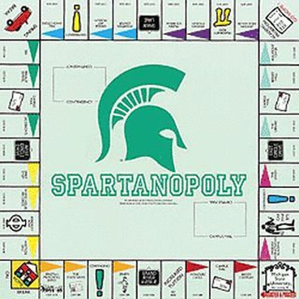 A Monopoly variant using locations in East Lansing, Michigan instead of Atlantic City. Tokens are wood "text books". Houses & hotels are red and white plastic push pin tops. Chance & Community Chest cards are replaced with "Contingency" and "Campus Mail" cards. The board is identical to Monopoly except for Park Place ("The Union", in this case) is swapped...