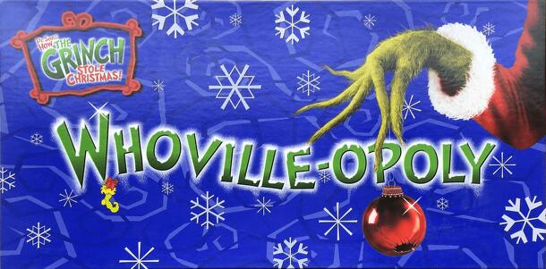Whoville-opoly is a Monopoly-like game based on Dr. Seuss's How the Grinch Stole Christmas. From the back of the box: " A curmudgeonly recluse whose heart is two sizes too small, The Grinch resides in his cave high atop Mt. Crumpit with his dog Max, and plenty of lettuce juice, extra virgin castor oil, and sour milk for sustenance. If you're hungry for...