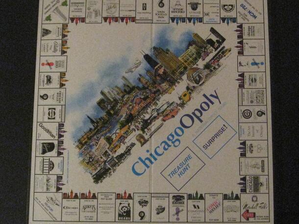 A Monopoly variant based in the Chicago area. Comes with a short history of the Windy City, printed on the inner box. From the instructions: "Entrepreneurs acquire Business Licenses, develop Offices, and purchase various goods and services (thereby stimulating the local economy)... Accumulate the portfolio of business holdings with the greatest net worth."...