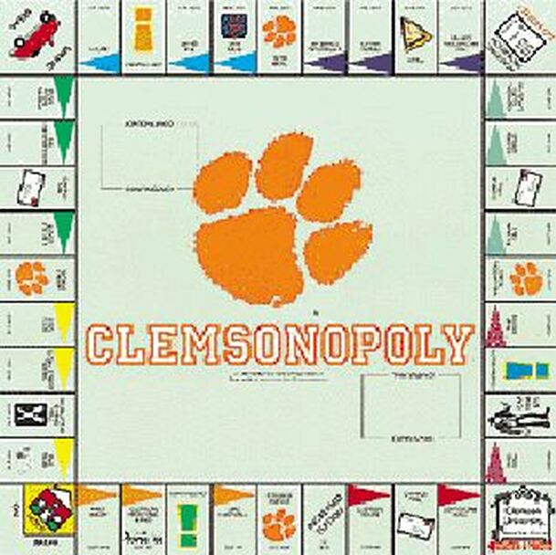 The Game Includes: Tokens: Alarm Clock, Pencil, Gym Shoe, Bicycle, Graduation Cap Board Spaces: Skies Hall, Death Valley, Tiger Town Tavern, First Friday, Clemson House, Sloan Street. Cards: Recite the Fight Song or Lose One Turn. Parking in Faculty Parking! Pay $50. Graduation Fee! Pay $25 for each Year of Credit and $100 for each Diploma. Calhoun...
