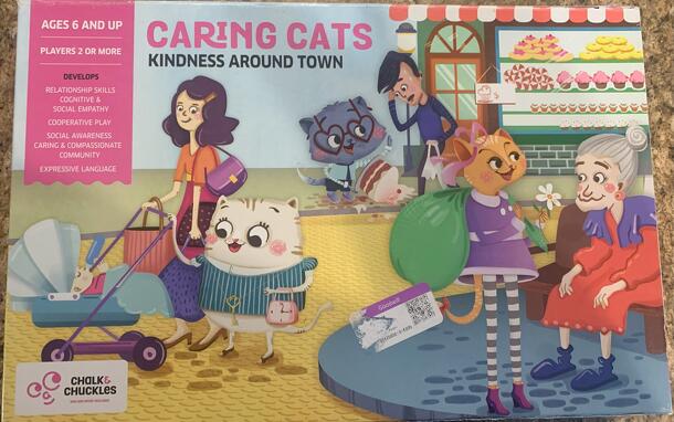 Board shows mini-track on left with 7 spaces leading to the School of Pawsitivity and larger track on right with two holes in it to store Caring Cat tokens. Game includes 4 cat mover/standees, 1 Mean Mouse mover, 20 Caring Cat tokens (4 each for 5 different cats), 20 Heart/Charm tokens, and 30 cards, each showing an area around town and a situation (e.g. a...