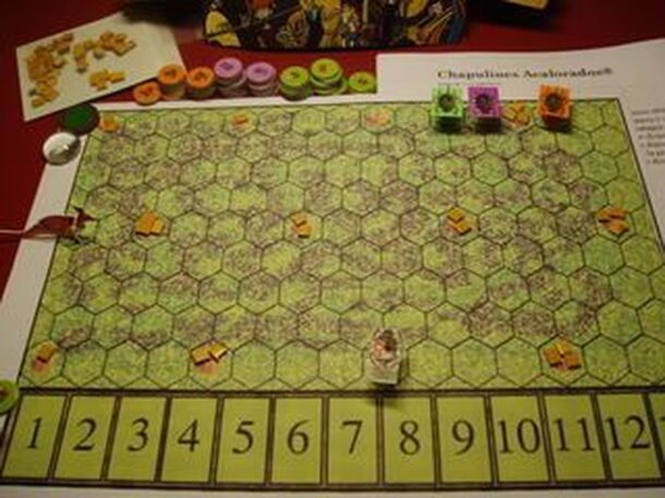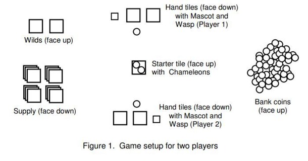 The players jointly build the board, one tile at a time, as the game progresses. Each time a player places a tile that forms a group of three or four like-colored tiles, that player receives points, with the quantity depending on the group configuration and on chameleon (pawn) positions on the board. If a player places a tile adjacent to a wasp (die), he...