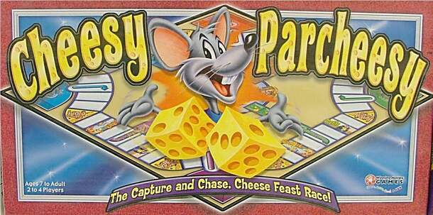 This is a new version of Parcheesi with a cat and mouse theme. Players race to get their four "mice" pieces around the board, up their secret passage, and onto the Cheese Feast space in the middle of the board. Like normal Parcheesi you may bump other players back and form blockades. You can also land on Cat spaces that send your mice back, and draw Cheese...