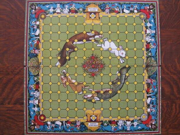 In this game, one player acts as the fox and the other acts as the rabbit. This game board has circular spaces arranged in a grid and the fox and rabbit pieces start in their respective corners. To move, you roll two dice. You must advance your piece in one direction the full number of spaces indicated on 1 die (your choice), then make a right turn and...