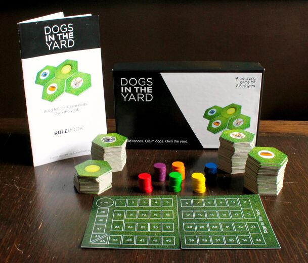 Dogs In The Yard is a tile laying game for 2 to 6 players. It's a game of both chance and strategy, where you and your opponents take turns drawing tiles to build out a map one tile at a time with grass and fences, and try to construct yards around dogs to earn points. They also have to make sure their dogs are fed and watered, and can get extra points...
