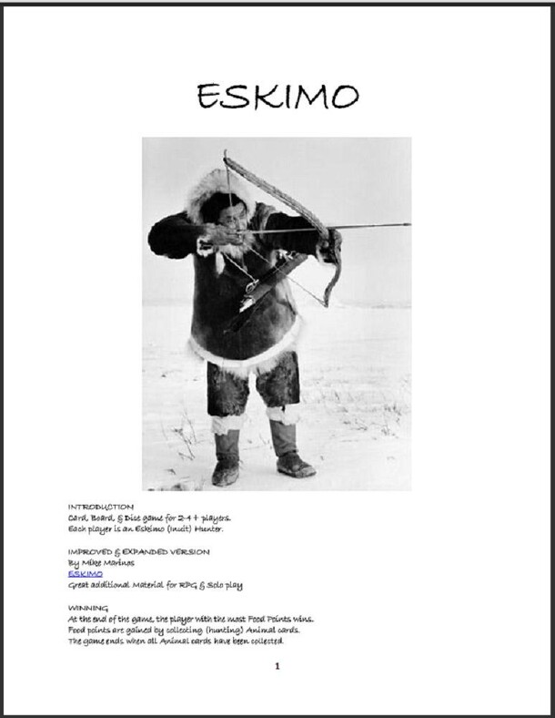 “Card, Board, & Dice game for 2-4+ players. Each player is an Eskimo (Inuit) Hunter.” The game is played on a circular track of 16 spaces. There are three types of spaces on the board: shelter, hunting grounds, and ice. Two decks of cards are used, the Animal Deck and the Hunter Deck. The Animal Deck is composed of the animals that may be captured by the...