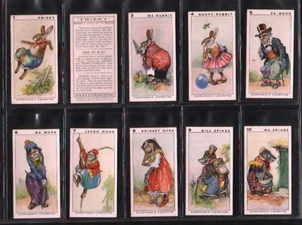 Card game issued one card at a time in cigarettes made by W A & A C Churchman. Two games are described using these cards. Frisky Families is a Happy Families game. 52 cards were issued, in 13 sets of four. Each set of four is attributed to a different animal. Frisky himself, is card no 1 and he is a rabbit. The game play is similar to other set collecting...
