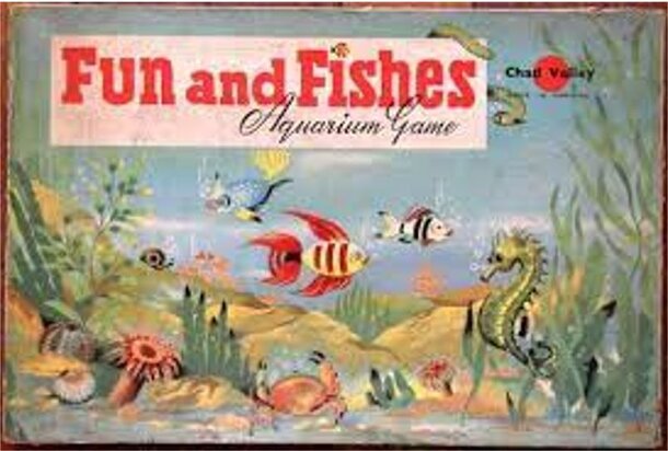 At the start of the game each player selects a set of six tokens, e.g. fish or crab tokens, and one colored peg. Players spin the pointer in turn and a six is required before a player can move. Having scored a six, the player pegs his token in to the lowest hole of any of the four tracks and moves it up the track according to the numbers scored in turn....