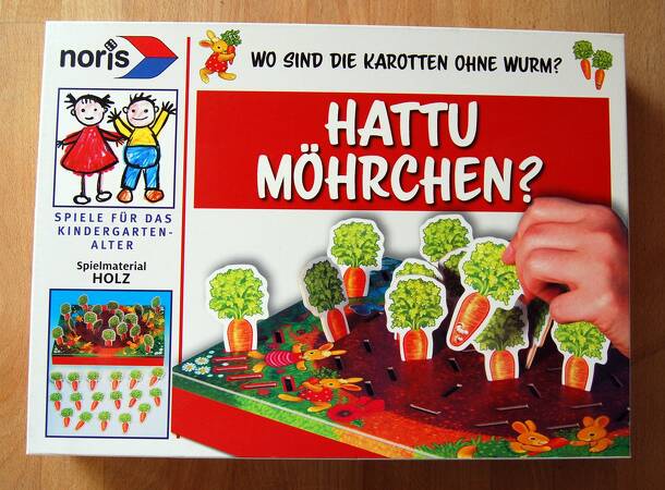 33 slits in the board carry carrots, one slit is empty. In his move a player pulls out a carrot - if it is good and without worm the player puts in into his rabbit den. A bad carrot with worm goes back into the field in any place chosen by the player. The first player to collect 5 good carrots wins the game. In a variant the board can be turned 90 degrees...