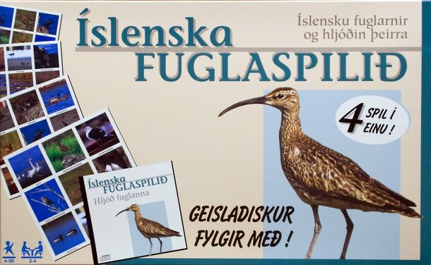 A simple educational game about Icelandic birds. The game comes with a CD with the calls of 30 birds. Rules for three kinds of games are included, Sound Bingo, Photo Bingo and Memory. The bingo cards have photos of 9 birds each and the players either listen to bird calls or are shown photos of a bird and try to get a bingo. Memory is simply a memory game...