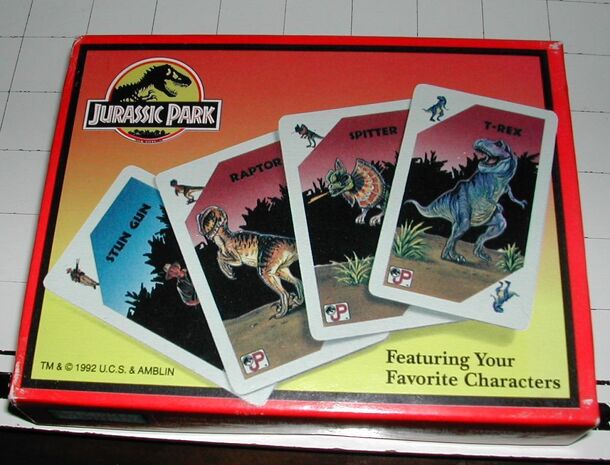 Based on the first movie, of course. This huge Milton Bradley box contains an over-sized board with a rather flimsy Visitor Center building; stand up cardboard pieces for the various movie characters, and a bunch of plastic miniatures of the more dangerous dinosaurs (a T-Rex, Velociraptors, and Dilophosaurus). You start off at the other end of the island...