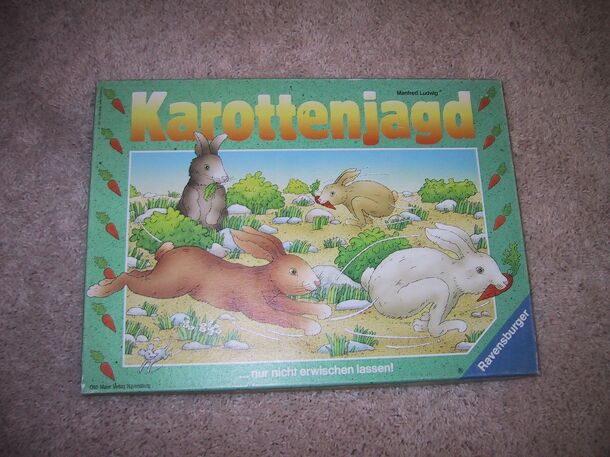 Each player plays a rabbit hunting for carrots. The board shows a maze of paths. Some fields show carrots, some others are numbered. Before a move, the active player chooses which die to use for movements: the d8 instantly moves a rabbit to the target field, while the d6 is for "normal" movement. One rabbit is on a green stand, and only this rabbit can get...