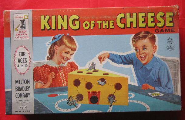 A huge yellow 3-D cheese made from thin cardboard dominates the center of the board. Players use a spinner to move their mice in turn along the predetermined path, which meanders around the board & through the cheese a number of times. The cheese has many holes which correspond to normal board 'spaces' - some holes are just large enough to accept the mice...
