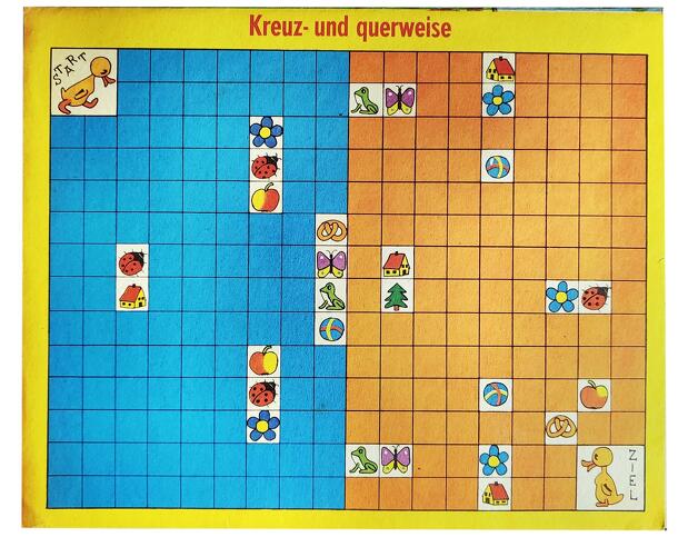 Shuffle the number tokens and give each player five of these. In addition, everyone receives a different colored Halma figure. These pawns are placed on the "Start" space. Now the first player plays a token and places his pawn according to the given number of points. On the left half of the board blue) the pawns may be moved orthogonal in any direction....
