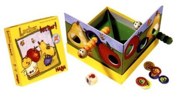 In Lecker oder Gemecker! players want to feed animals the food they like best, earning coins as they do so. To set up the game, six animal cards are placed in a circle, then one plate of three different foods (out of six total) is placed in the hole on each animal card. These three foods are in three sizes: small, medium and large. On a turn, a player...