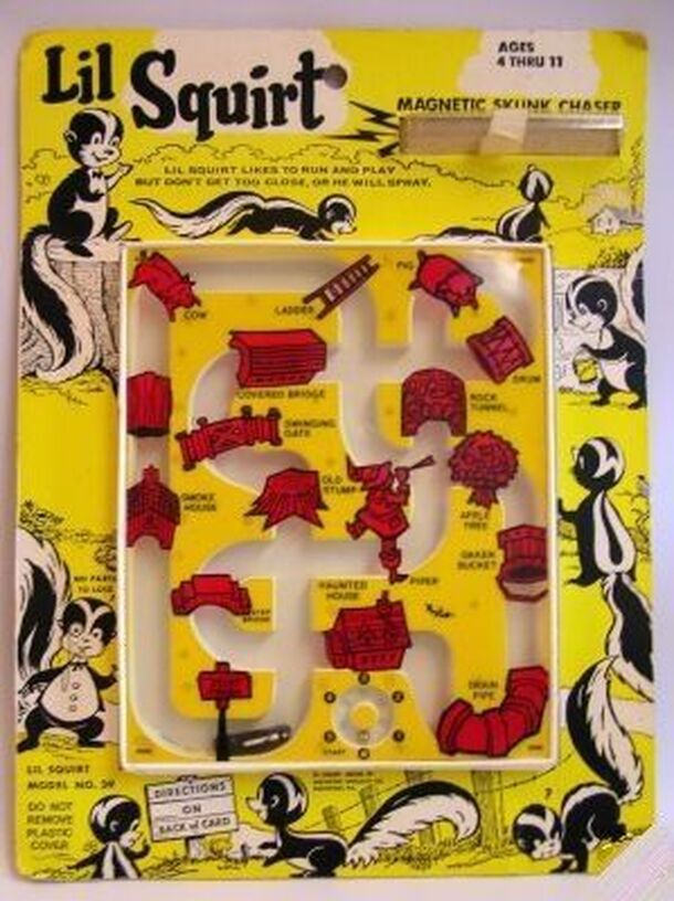 A children's dexterity game from the 1950s that is very similar to the game "Tickle Bee". The display is mounted on a yellow board and comes with a "magnetic skunk chaser". A player must navigate the skunk through the simple maze under such red-colored objects as a ladder, a piper, a pig, a drum, a rock tunnel, a covered bridge, a haunted house, a drain...