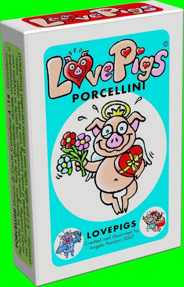 LovePigs (Porcellini) is a party fun game, presented as a Prototype at LuccaGames06 in Italy. In 2007 Post Scriptum published LovePigs, in ModCon 07 the 1st National Tournament. All PhotoReports on www.warangel.it the designer's website. It is a game that tests the feeling between couples, partners may be: dad and daughter, wife and husband, teammates...