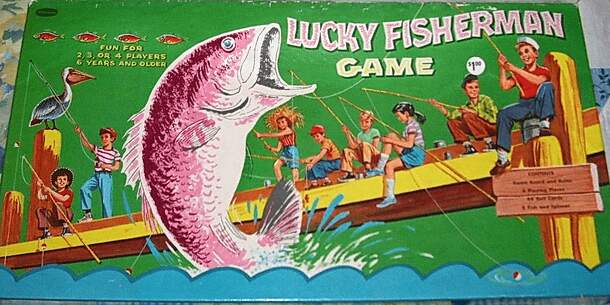 Lucky Fisherman features four colors player colors, each with a pawn and 11 matching bait pieces. Each player spins a spinner and moves on the board. The color of the landing space indicates if you get to move your bait closer to a fish, move back, lose bait, spin again, etc. Once you get your bait far enough it goes in the net and you catch a fish. There...