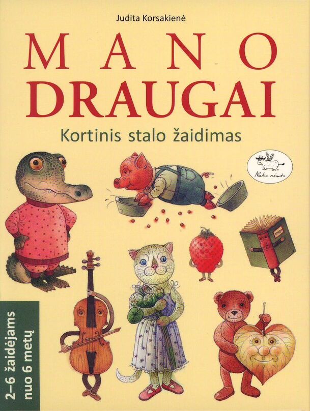 The aim of Mano draugai is to gather your group of friends by collecting cards with points. In the game characters from books of Kęstutis Kasparavičius are used. The game contains: - 15 large cards with 3, 4 or 5 characters on each; - 35 small cards with 1 character on each; - 21 small cards with a pair of characters on each; - 6 small "almighty" cards; -...