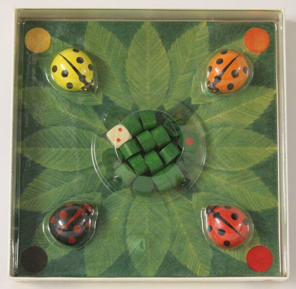 The board depicts leaves, on each of which a wooden chip is placed. Most of these chips are aphids, but three aren't (turn them around to find out which!). The players roll a die and move their ladybug to an aphid chip. When it actually contains an aphid, the player can keep it, when not, he or she has to return an aphid already taken. The player with most...