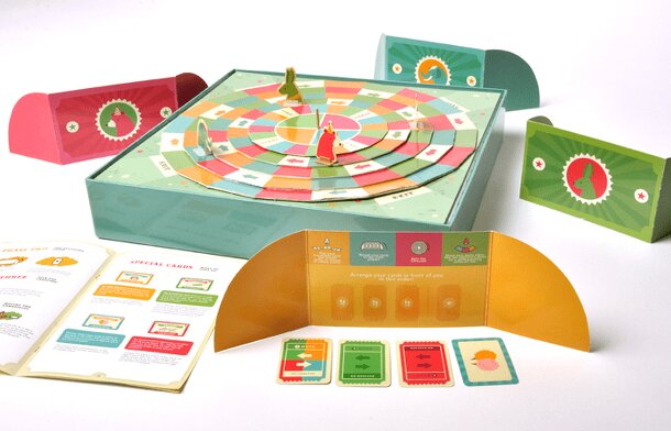 In the game you play as a Carousel animal who wants to escape the Merry Go Round and become a free animal. the winner is the first to reach the exit on the board and the freedom of the outside world. The game is made of 3 phases. phase 1: in each turn you get 5 movement tickets and 2 special cards. You now plan haw to move. you can play 3 movement tickets...