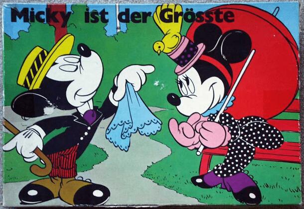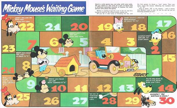 A game that featured in the British Disneyland Annual for 1977. A simple Goose-type game. Mickey Mouse wants to go out in his car but his friends want to go with him. He has to wait until one friend arrives (and he looks very cross as he waits by his car). Players move by a die roll and must obey the special squares. The first player to reach square 30...