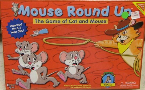 Designed by a six-year-old from Kansas, Mouse Round Up is the winning entry from the National Young Inventors' Contest. Players take on the role of "cowboy" cats trying to lasso mice. Using a spinner for movement, you travel around the board trying to land on mice spaces. If you do, you take a plastic mouse and place it in the lasso picture of your cat....