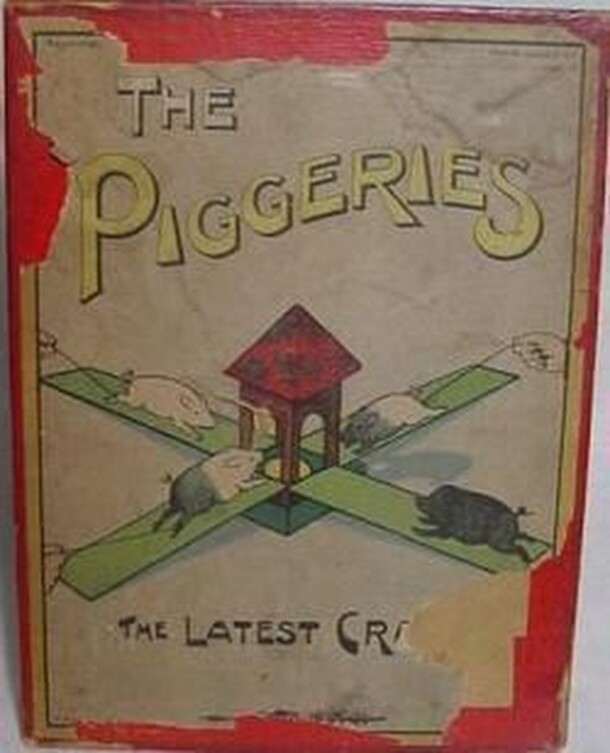 The Piggeries game is played by each player gently pulling a string on the back of their respective pig to advance it toward the center of the game, which represents a well. Players can place bets using the enclosed game counters. There are four wooden pegged tracks, four hand painted wooden pigs, a "well" for bets, and a cardboard roof for the well. The...