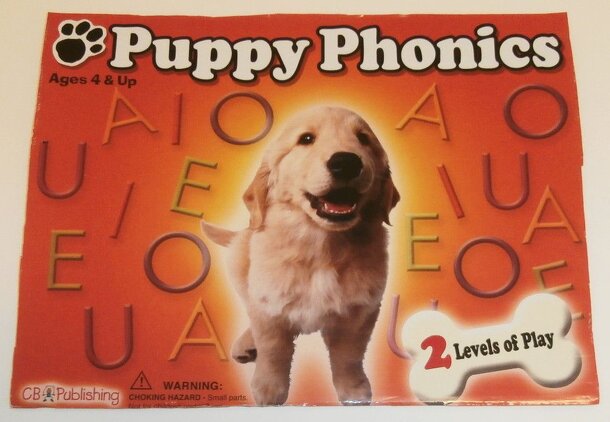 Puppy Phonics is an educational game about consonant blends and short vowel sounds. It is designed to be enjoyed by 2, 3, or 4 players age four and older. Each player twirls a spinner and names the sound indicated... for example, A E I O U. The player then advances his or her puppy token to the next space on the illustrated pathway which features an image...