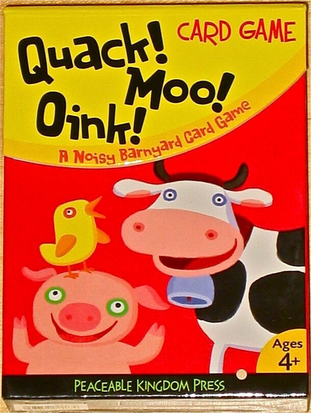 From the box: "Break out your best barnyard sounds for his raucous matching card game. When you spot a match, shout out the animal sound, and grab the cards. Collect them all and you win!" This is pretty much the card game War played with animal pictures and noises. The deck consists of four cards each of twelve different animals. Each player turns up one...