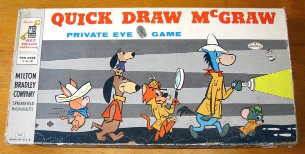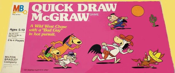 Somewhat like snakes and ladders, the object of Quick Draw McGraw is to move your characters and be the first to reach the ranch. Alternate paths provide detours or shortcuts, and movement is governed by a spinner. The players' pieces are characters from the TV Cartoon show. This game is not the same as the 1960 Quick Draw McGraw Private Eye game, which...