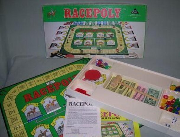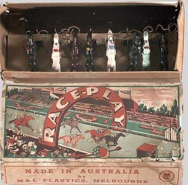 Australian action game. You get eight plastic horses, a good size, to which is attached a length of string (around 1 metre). The strings are unwound to their full length and will stretch from the control box to the start line . At the start everyone frantically rewinds their string. The first horse to reach the control box, wins. The horses are named after...