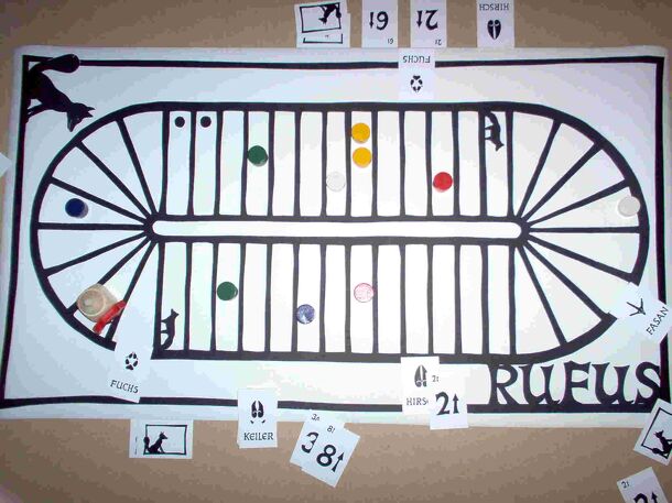This is the original version of Doctor Faust. It is themed as a Schnitzel hunt, or 'paper-chase' around an oval track. The animals chase after a wooden 'fox and cooking pot' piece. Each turn you have 7 points to use for placing a card, moving the fox and moving one of your own two pieces. Cards are placed face down next to the track and another player...