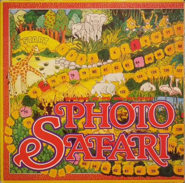 Photo Safari is one of several "LP games" released some time in the 80s, where the "box" is the shape and size of a record sleeve and folds out to reveal the board. This game features a spirally linear track through the jungle, along which players move their pieces according to the roll of the die. Some squares offer photo opportunities which yield money;...